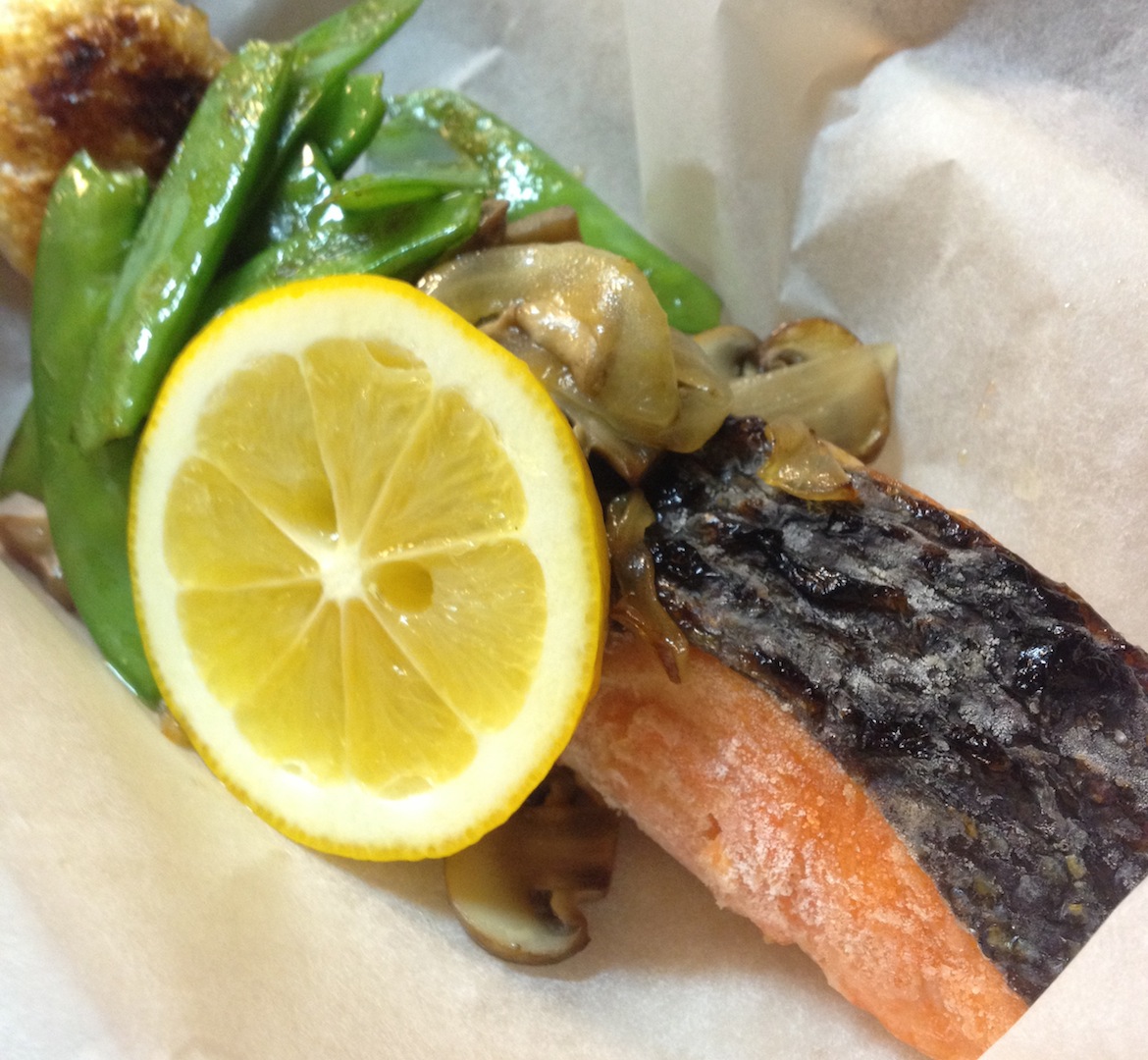 鮭の包み焼き 魚介類 2013年04月02日 包み焼きといえど 置き弁なので一度焼いたものを温めるわけで。味は全くつけておらず(鮭は甘塩)レモンをしぼる程度で結構美味い。玉ネギ、マッシュルーム、絹さやをソテーしたものを添えて。色的にはプチトマトもあるといいのだけど 焼きトマトは不評。この状態で冷蔵庫保管。アルミに包んだおにぎりは鮭と一緒に温めても おにぎりだけ熱が入りにくく冷たいとクレームが。