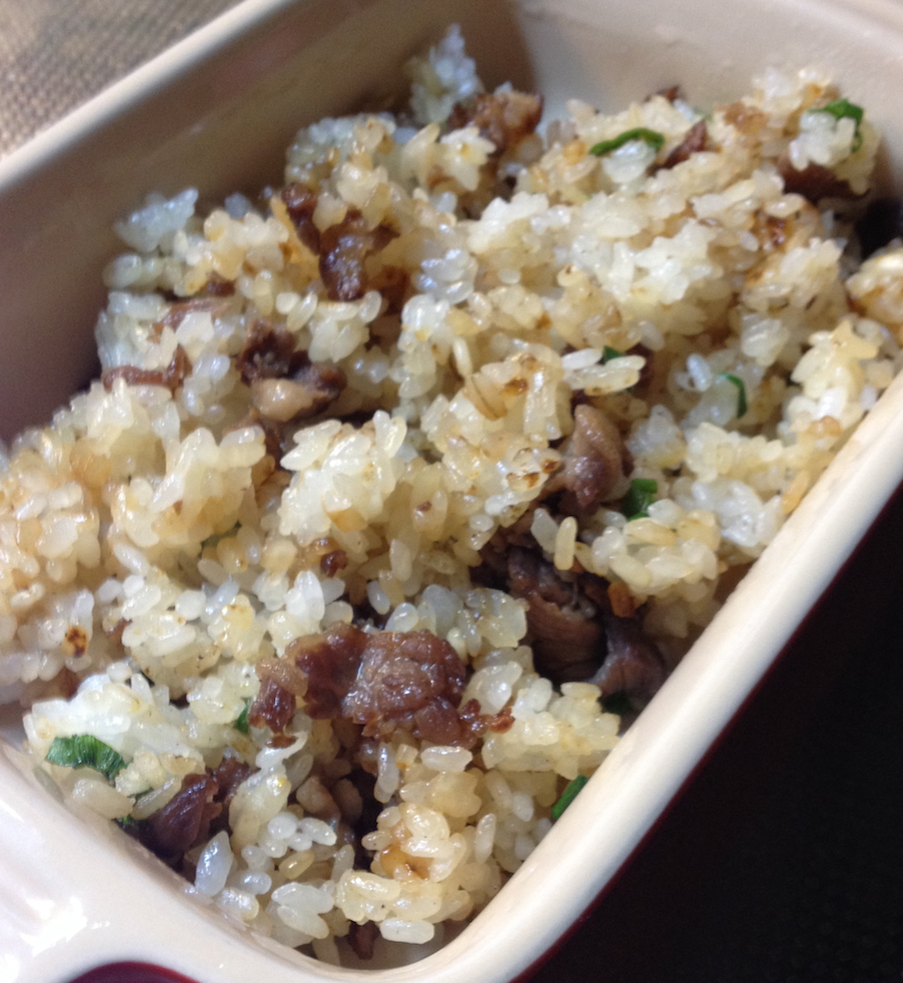ガーリック炒飯 炭水化物 2014年01月16日 我家の定番、ガーリック炒飯。土鍋でご飯を炊くと あまりご飯が少しずつ出る。いくらかたまったら炒飯、という流れ。ご飯は冷凍せず、冷蔵庫の中でぱらぱらにする方が炒飯には使いやすい。 にんにく薄切り、牛肉の切れ端、塩少々、焦がし醤油。この時は 最後に青葱をざっくり。大人は食べる前に黒胡椒をごりごり削る。置き弁に使う場合は ガーリックは入れない。息子はガーリック本体を食すのは苦手なのに香りは好き、という複雑系。普段からリクエストされるのだが炊きたてのご飯で作ると「今日のはなんだか(マイナス方向に)いつもと違う」となる。ーーーーー近況をば。勤務先で近々私の担当業務が変更予定。現在引継ぎ中。適度に年とって そこそこ経験あるつもりでいたけれど未知の分野、知らないことはたくさんあるものだなあ、と。
