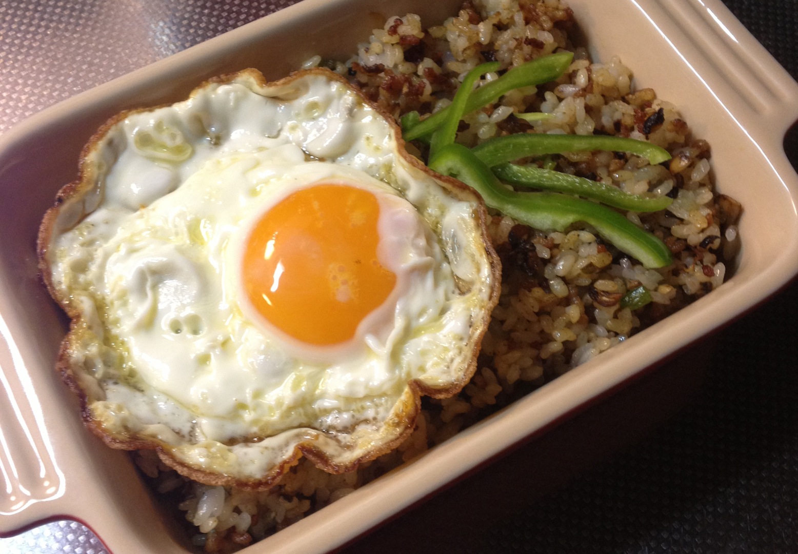 カレーチャーハン 炭水化物 2013年04月25日 ナシゴレンを目指したかったのだけれど 息子はスパイスに好き嫌いがあるので普通のカレーチャーハン。写真では ひたすらにブラウンだけれど玉ネギ 豚挽き肉 ピーマン ぶなしめじが仕込んである。ピーマンは積極的に好きではないのに チャーハンになるとアクセントとしてツボらしく、入っていないとクレームをいただく。今回、彩りとしてピーマンの細切りをのせてみたら何も言わずに食べていた。