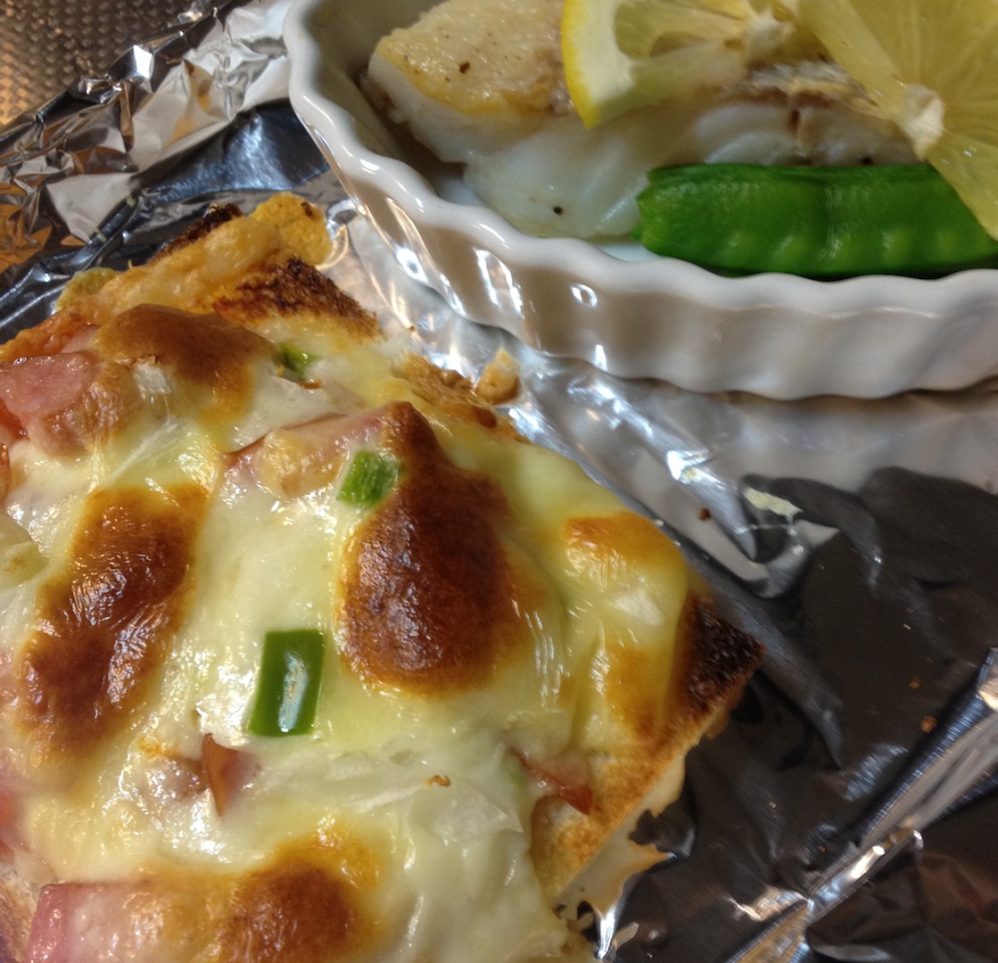 ピザトースト 炭水化物 2013年06月20日 耳のない薄手のサンドイッチ用のパンで、と 細かいリクエストが。「こうして欲しい」という積極的な要望は大歓迎。トマトソースはいつもの玉ねぎ&きのこで作ったもの。今回のメインは えびの高原のソーセージ。ピーマンと玉ねぎのみじん切りをぱらぱら散らせてモッツァレラチーズとスライスチーズ。朝 一度焼いたものを 冷蔵庫で保存。彼が食す夕方に 再度トースターで焼く。チーズは2度焼きしない方が美味しいだろうなあ。小ぶりなサイズなので 3枚で1食分。サイドディッシュは鱈のムニエル。