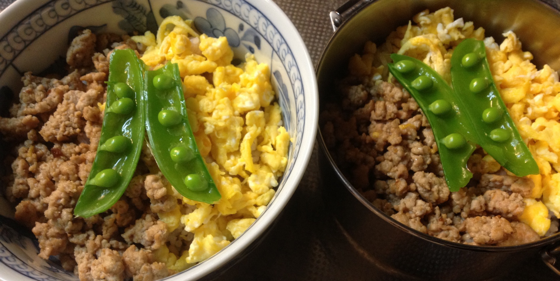 三色丼 肉 2013年04月15日 左が置き弁、右は私の弁当。今回は 鶏挽き肉。醤油+酒で下味をつけ、ごま油で炒める。炒り卵もごま油。三色目のスナップえんどうは、写真用にちんまりのせているけれど実際には完全に完全に縦筋として並べた。ご飯はいつも通り 白米+玄米+黒米。牛肉を使う場合は 塩・黒胡椒のみ。豚肉の挽き肉は トマト味と合わせるのが好きなので三色丼には使わない。