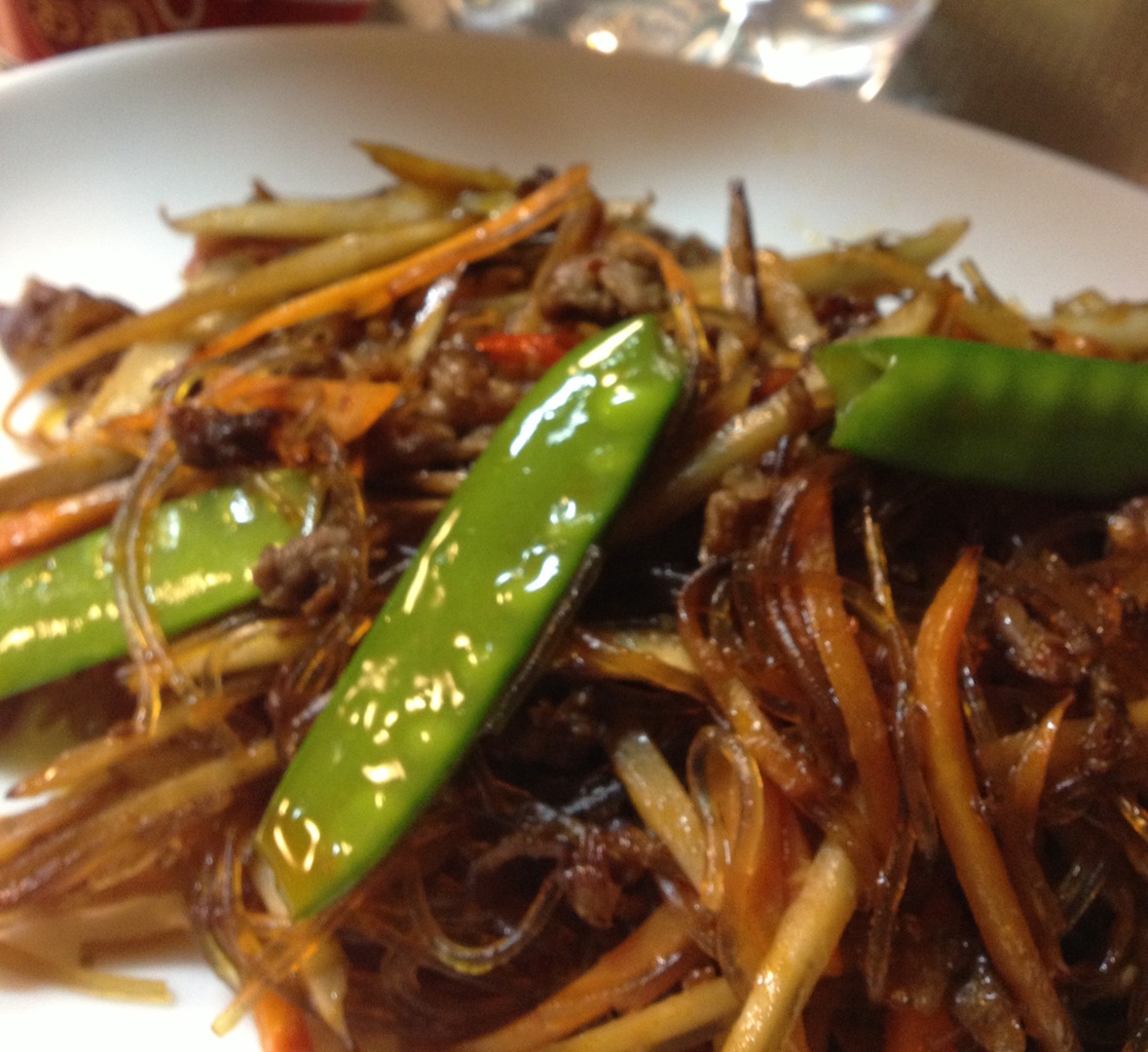 チャプチェ 肉 2013年06月17日 チャプチェのカテゴリってなんだろ、と悩みつつ肉料理に。肉で満足するほど入れないのだけど。にんにく不使用。作ってすぐに食べるのではないから。鷹の爪不使用。息子が苦手だから。置き弁では 耐熱硝子の器に入れて電子レンジで温め温めたご飯にのせて チャプチェ丼に。仕上げに ごま油をほんの少し。たくさん作ったので 私のお弁当にも流用。鷹の爪がないと 味が締まらないかと思いきや美味しい美味しい。ただ、丼にする場合、味をもう少し濃くして 水分をもう少し含ませた方がよいような。私の作るチャプチェは ほとんど牛蒡と人参。すきまにちょろちょろと春雨と牛肉がからまっている風情で。肉は切落しでOKだけど 春雨が脂の香りを吸っちゃうので脂の多い部位の切落しだと しつこく感じる。