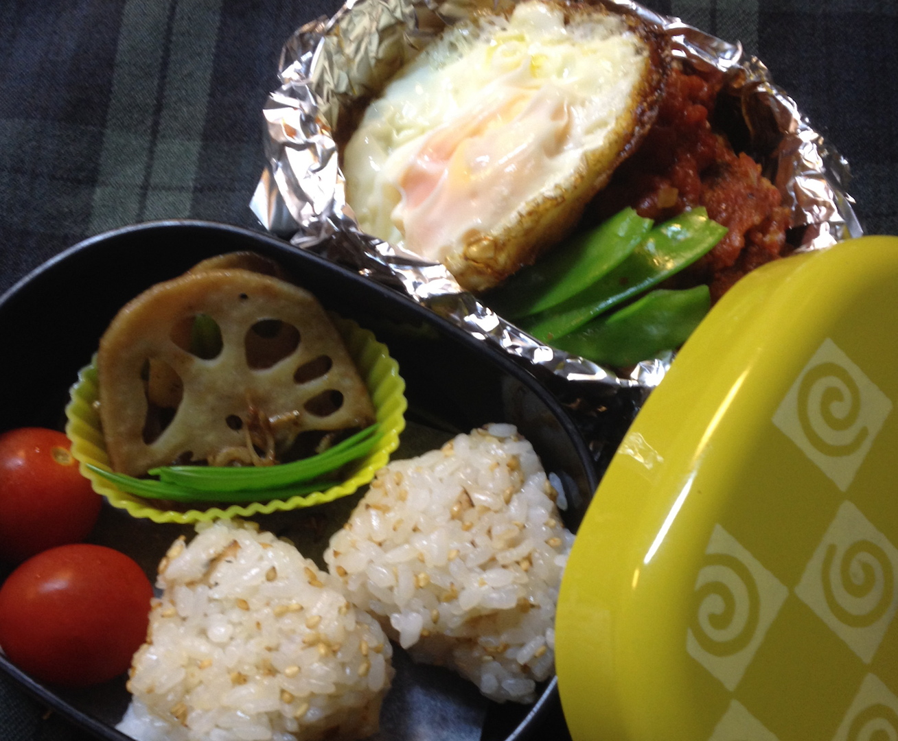 ロコモコ風弁当 部活弁当 2013年11月18日 丸いステンレスの弁当箱では まさにロコモコになるのだが本人の希望で部活弁当はひとまわり容量の少ない2段タイプ。ゆえに ご飯/ハンバーグ&目玉焼きは分かれることに。上にのせる目玉焼き、さっさと仕上げたいがために蓋を使ったら白膜のかかってしまう焼き上がりに。わかってたんだけどね。両面焼きの方がよかったかも。下のハンバーグは いつものトマト煮こみ。 下の段にはごまおにぎりと 常備菜の蓮根きんぴら。保存容器は専ら硝子モノを愛用。ジャムの空き瓶のほか、モロゾフ容器がダントツ大活躍(左ふたつ)。 左から薬味ねぎ(刻んでちょい置き中)、蓮根きんぴら/鷹の爪なし、蓮根きんぷら/鷹の爪入り。きんぴらは じゃこを入れるので出汁は使わない。
