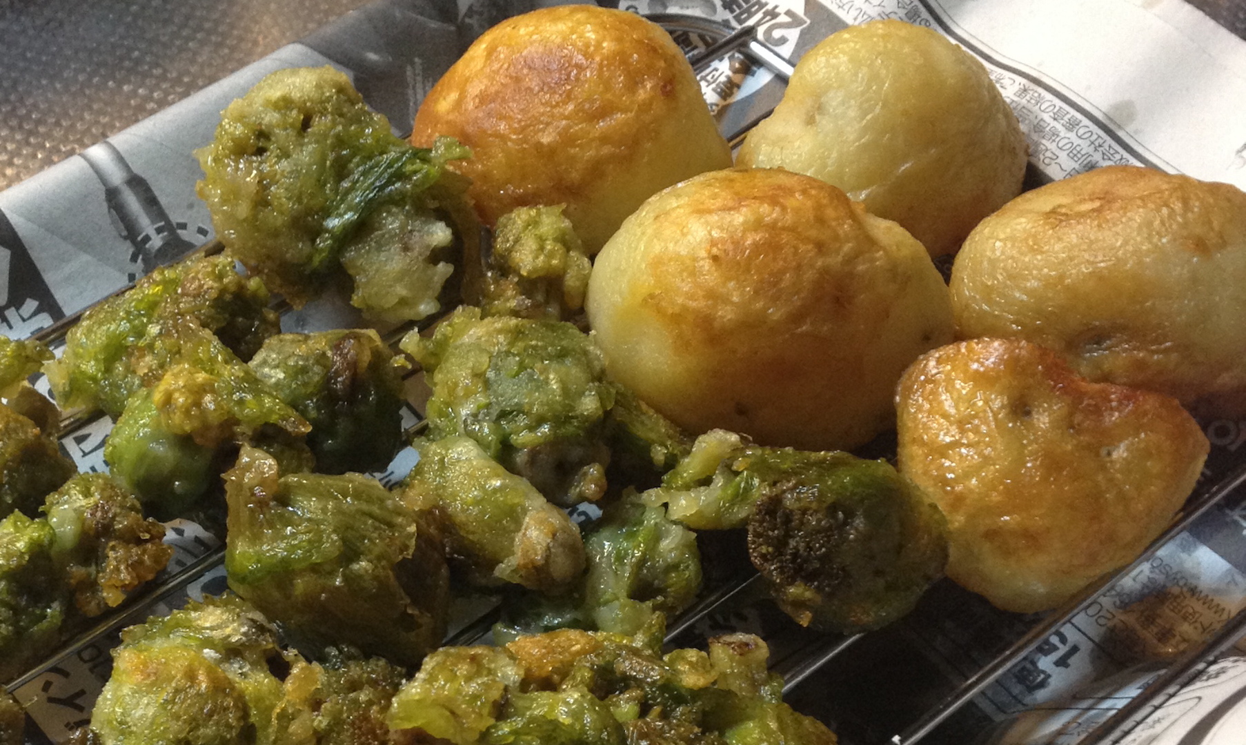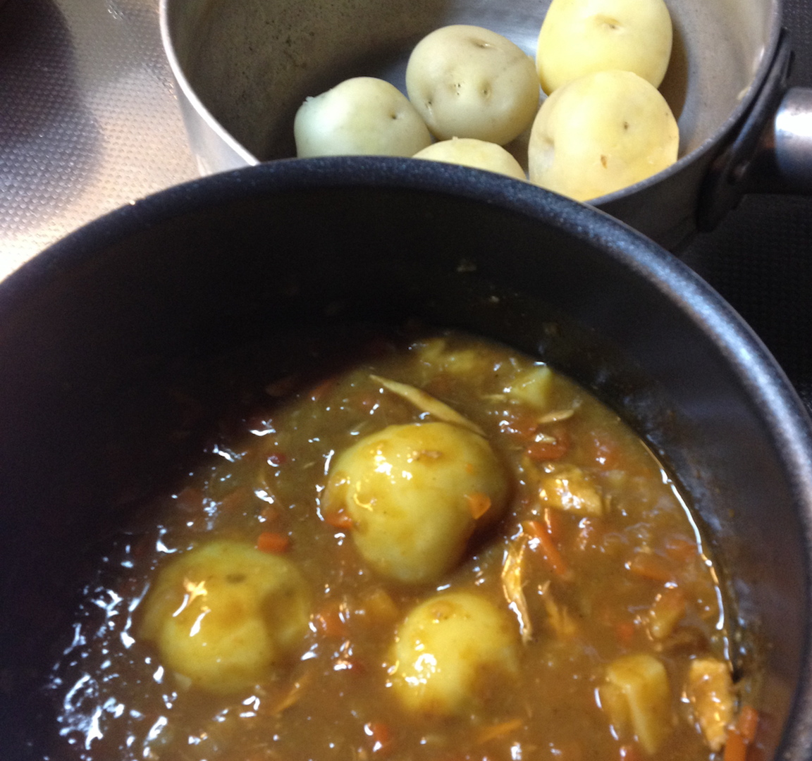 新じゃがカレー 汁もの/その他 2014年03月27日 我家では 手羽先チキントマトカレーが標準。玉ねぎを炒めるときにセロリみじん切りも合わせて飴色コース。クミン フェンネル マスタード(どれもホール)も一緒に炒める。煮込むときには かなりな量の生姜をすりおろす。息子は辛いのが苦手なので 彼のだけは別鍋にわけて市販の甘口ルーで仕上げる。 小さな新じゃがが美味しい季節。カレーの中には ひとつだけ ダイス状に切ったじゃがいもが煮込まれてとろとろにとけている。ごろごろと具として食す新じゃがは皮のままゆがいた後 手でぺろりと皮をむき丸いままころころとカレーに入れて。置き弁でなく すぐ食す時はこれを素揚げに。 新じゃが&ふきのとうの素揚げ。ふきのとうは酒飲み用。美味い。