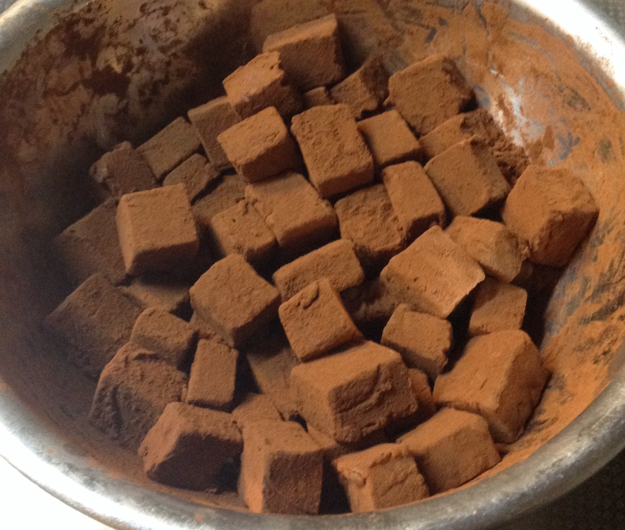 生チョコキューブ 汁もの/その他 2014年03月31日 置き弁ではなく 息子ショコラティエによる生チョコ。春休みのある日の夜10時過ぎ「今から生チョコ作る」と唐突に言い出した息子。10時過ぎからチョコを刻む息子。案の定 手伝ってと泣きが入り 半分ほどは私も作業。時間かかるのよね。生クリームを沸騰寸前まで温め刻んだチョコと混ぜ バットで冷やす。 キューブにカットしてココアパウダーをざっくり。 パウダーが多すぎて 粉っぽくなったり冷蔵庫保存ゆえの 固く冷たい感じが生チョコっぽくなく本人としては やや不満だった模様。将来、手作りチョコをもらった時に「チョコ刻むの面倒だったやろ?ありがとう」と言うのか「溶かして固めただけやろ?手作りとか言うな」と言うのか。さて。